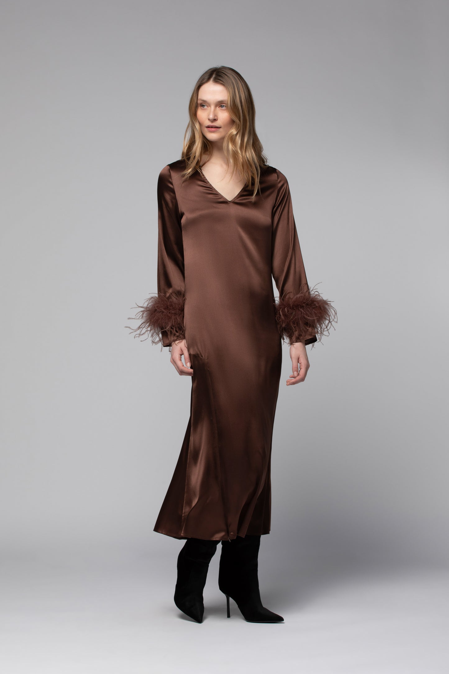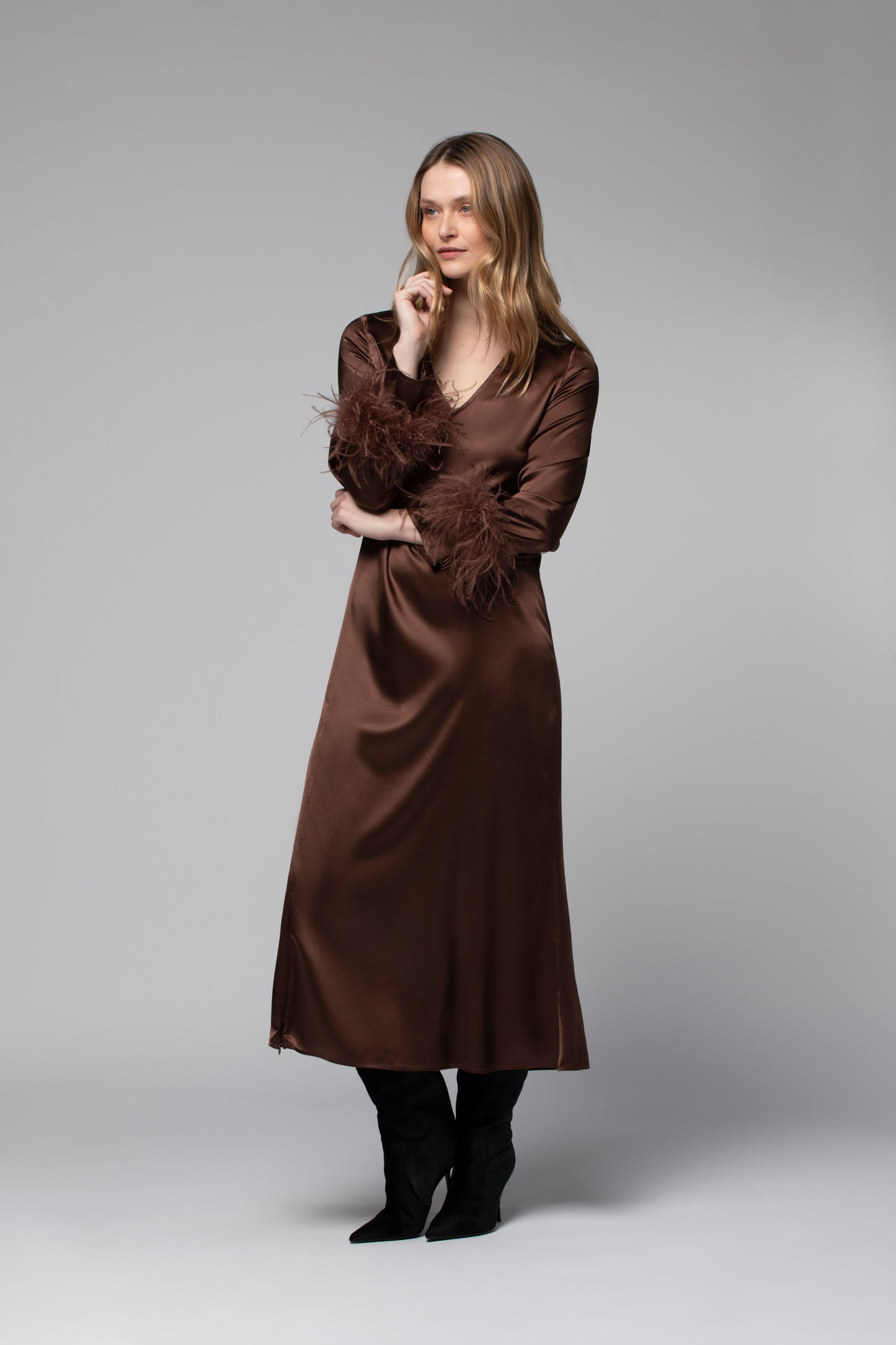 Chocolate silk long dress with removable feather cuffs