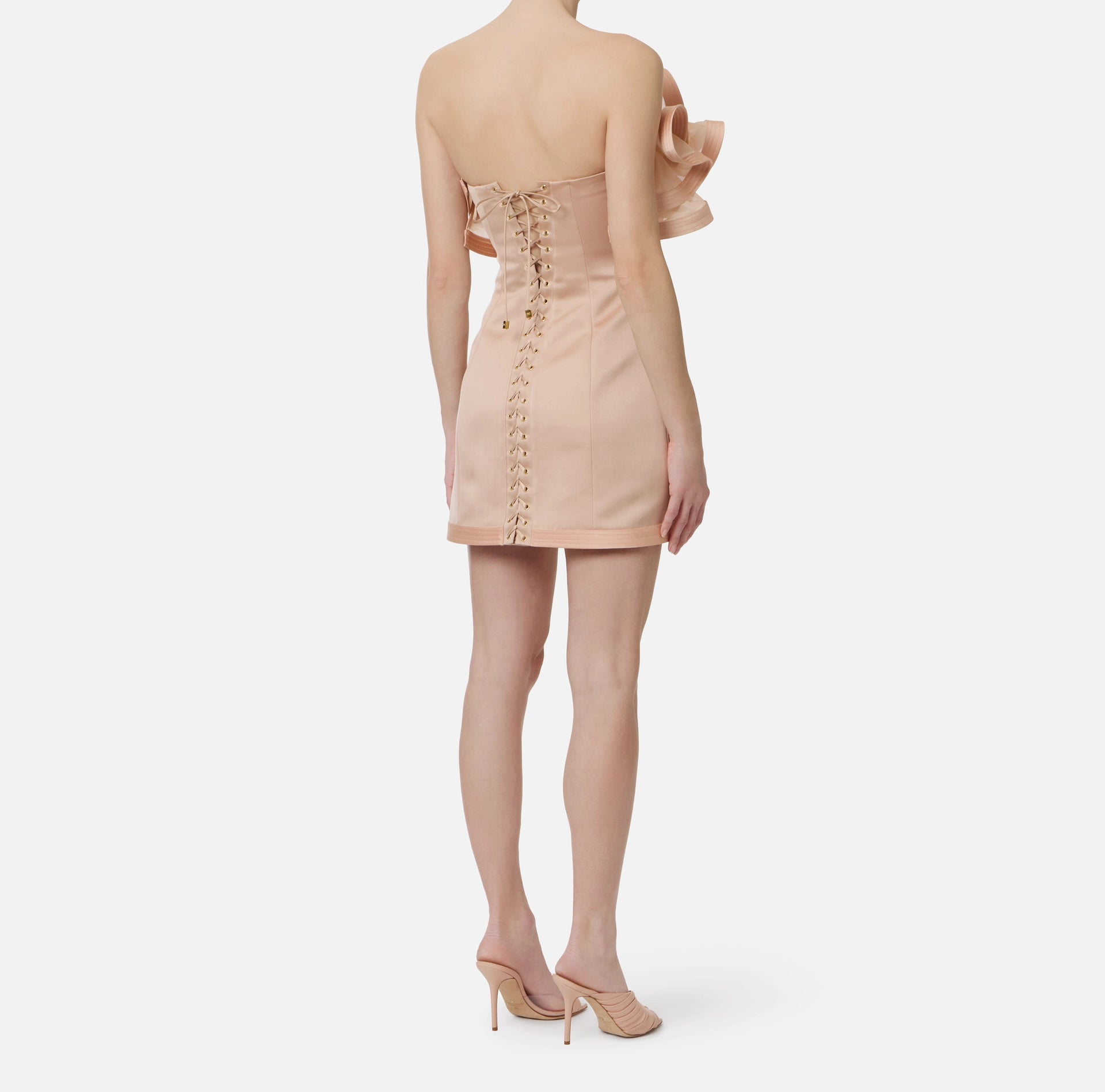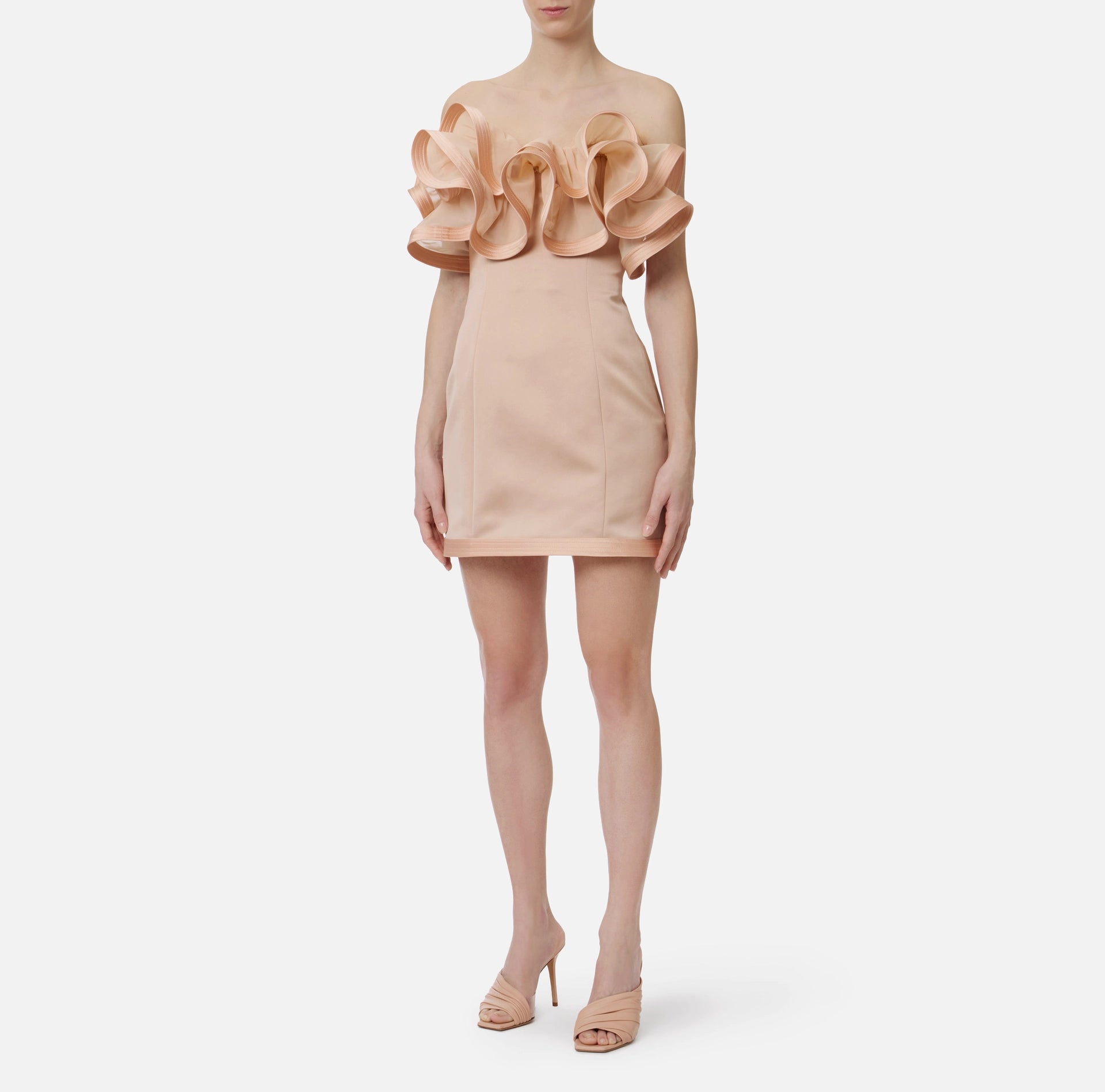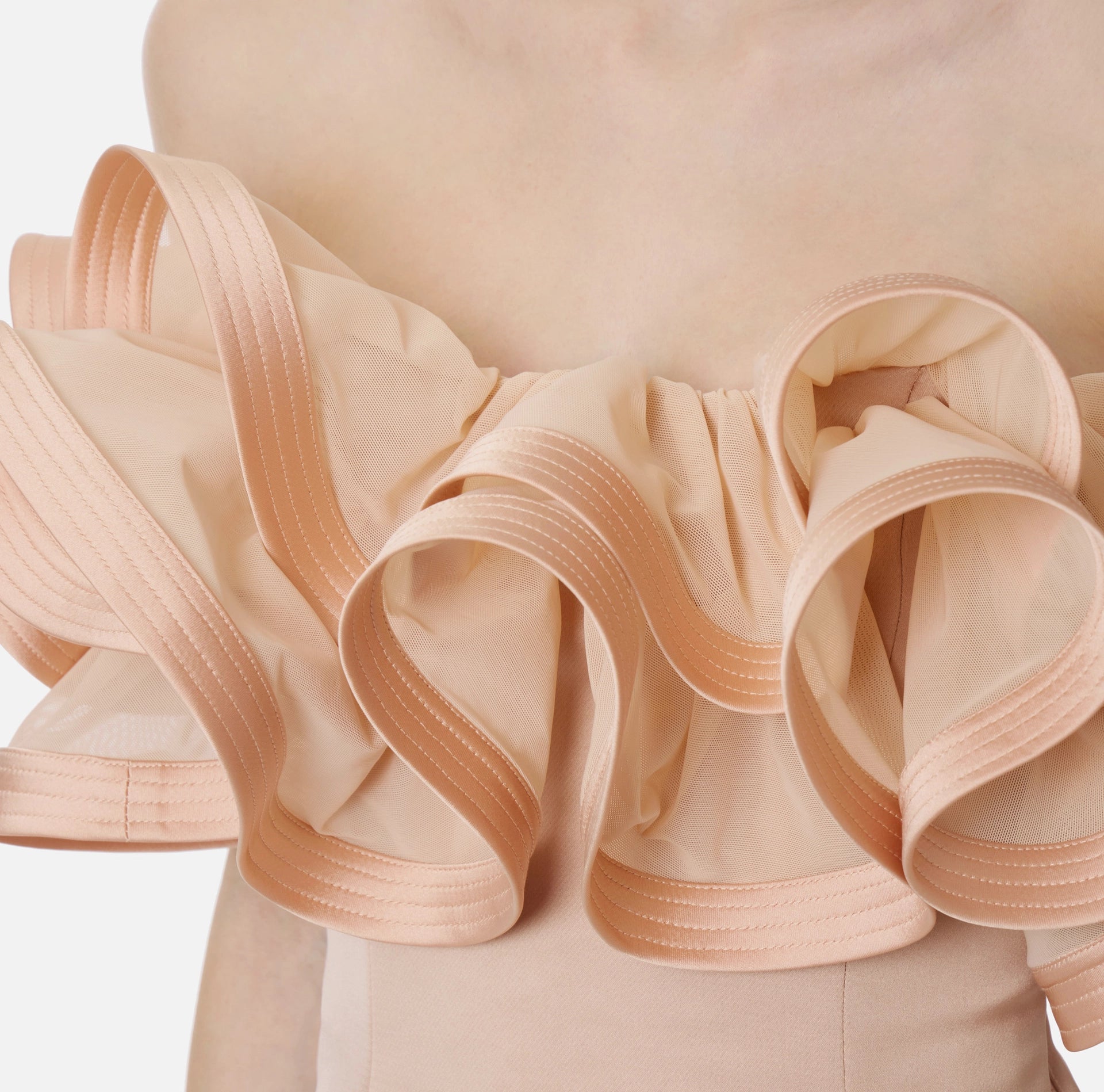 Duchess satin mini dress. The off-the-shoulder dress stands out for its maxi ruffles made of tulle, with satin trims for refined material contrasts. The back with matching criss-cross laces creates a striking effect, echoing the sensual lingerie world. Slim fit.