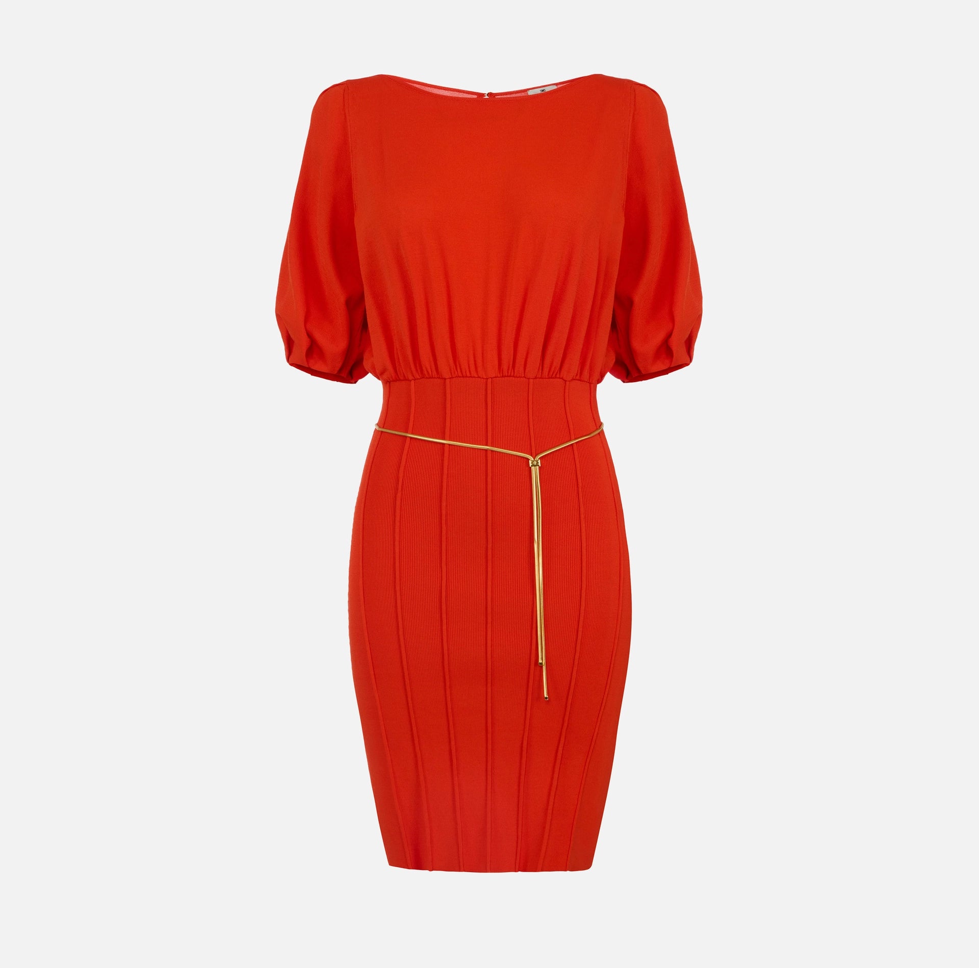 Red knit short dress with gold belt