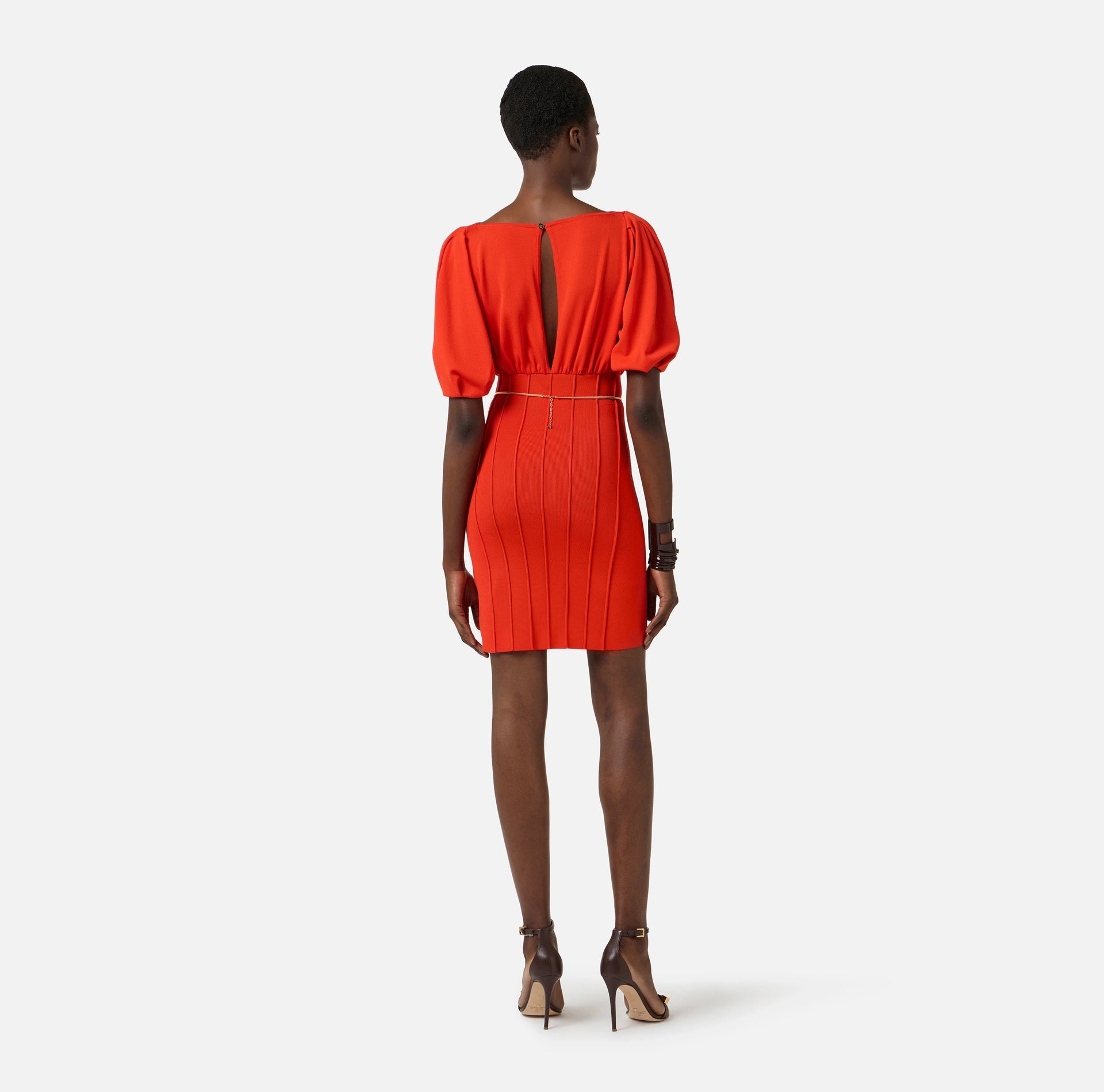 Mini dress in knit fabric with boat neckline and short sleeves. The dress is defined by ribbing on the front and back, inspired by the corset world. The belt with snake pattern brightens the waistline. The back reveals a keyhole opening with button. Slim fit.