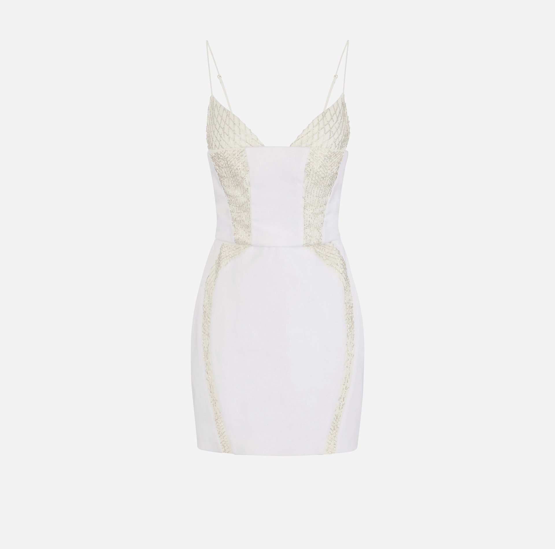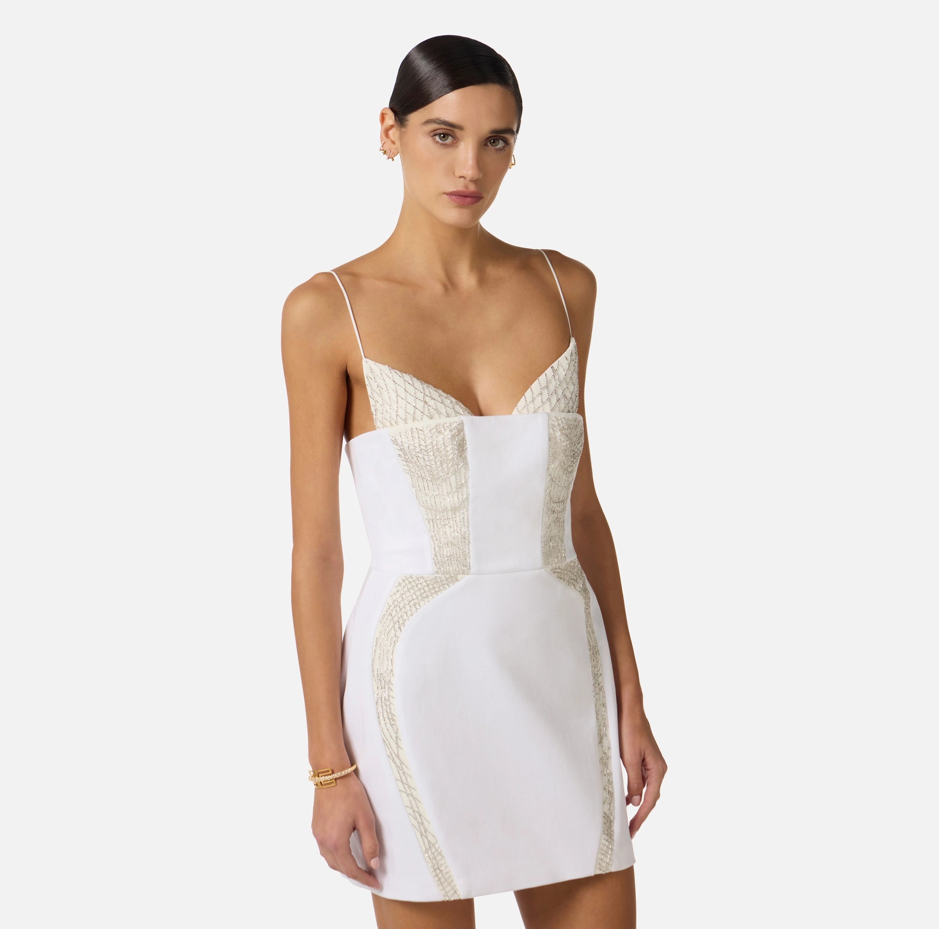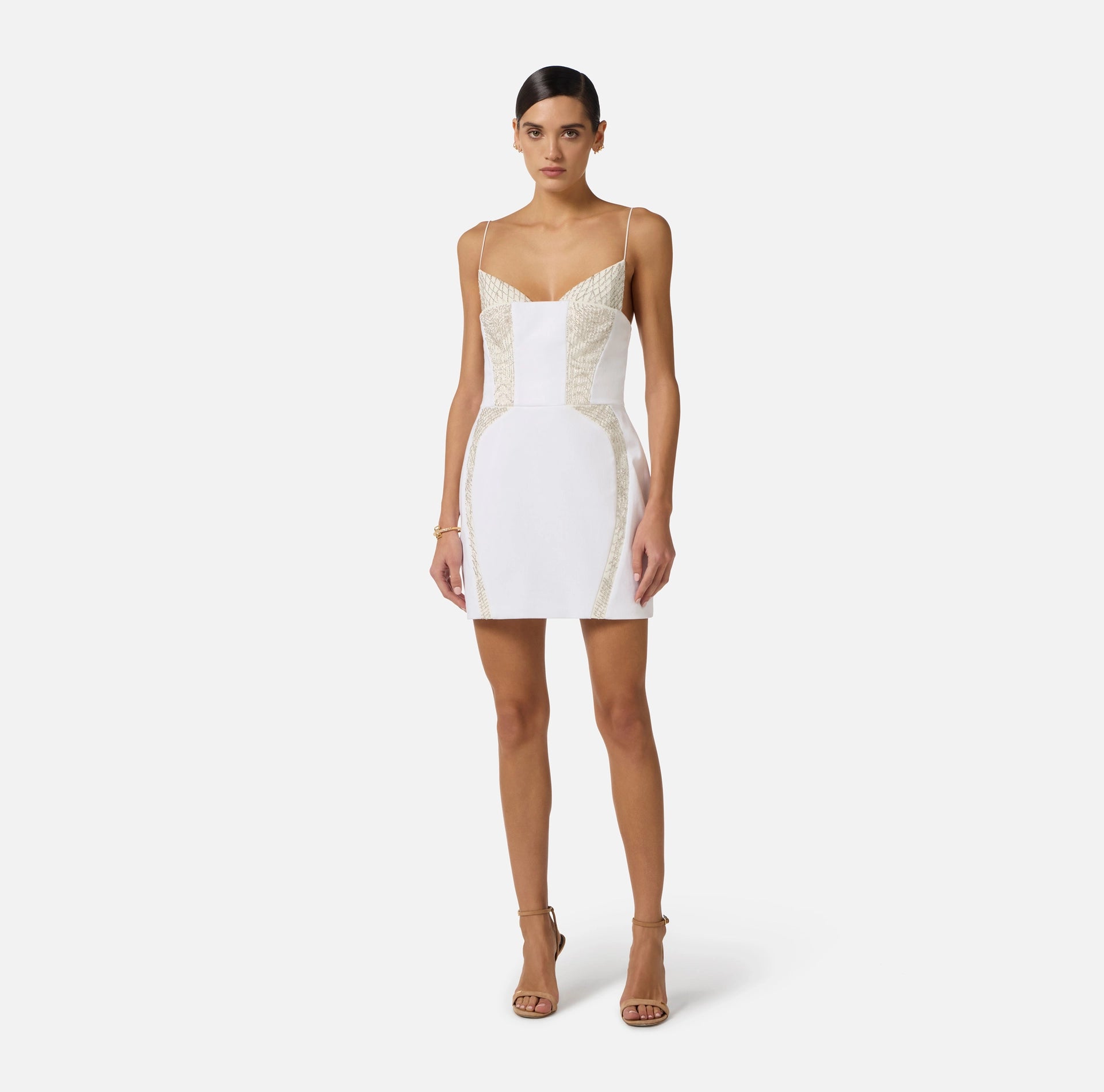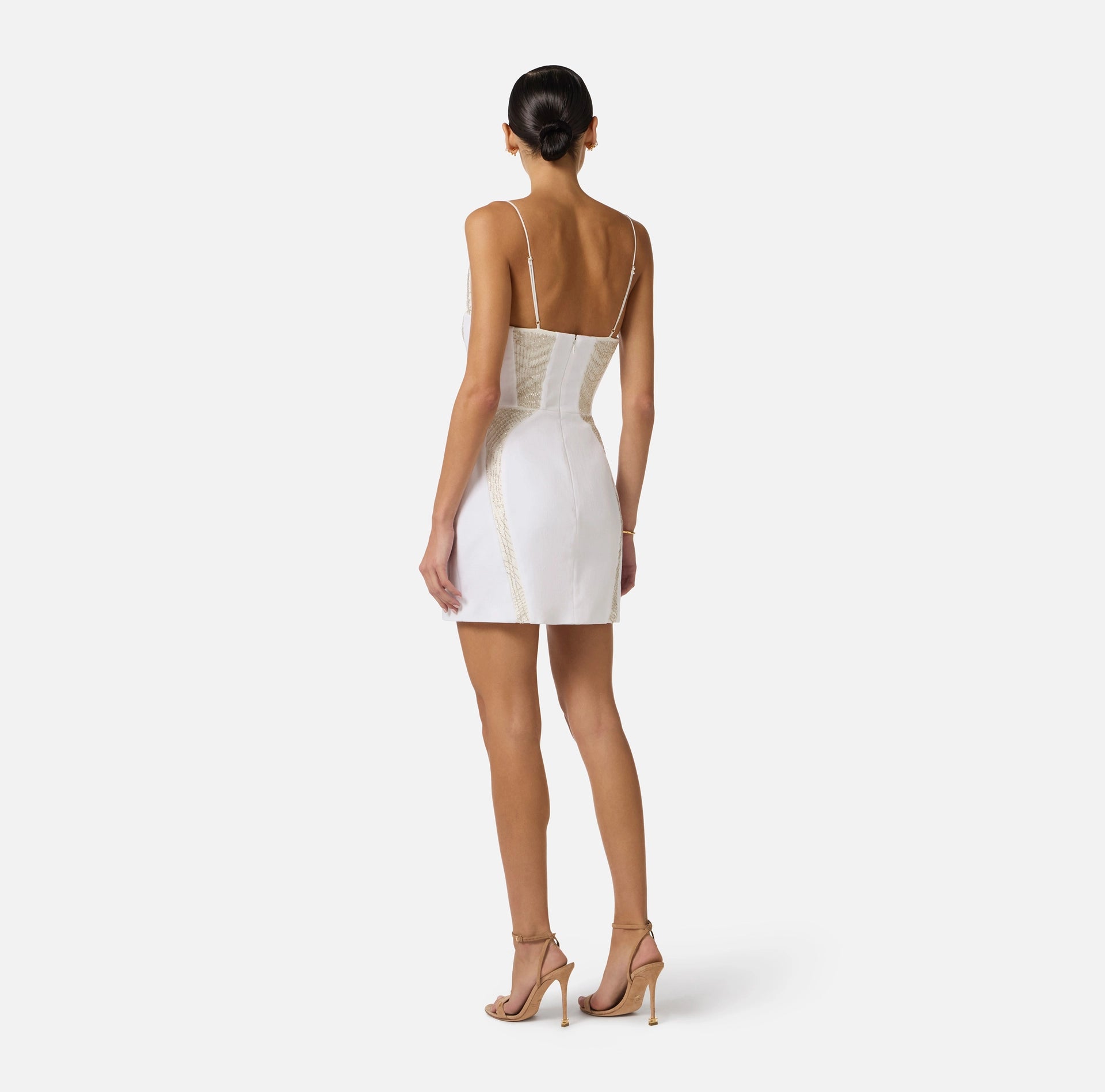 Cotton gabardine mini dress with slim fit. The dress has thin straps and stands out for the tulle panels applied to the bodice and skirt. The focus is on the embroideries where the crystals create contrasts of light and texture in a dynamic movement.