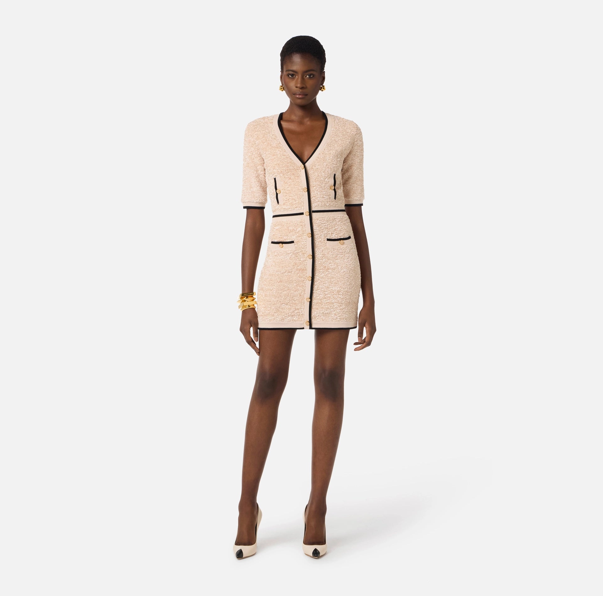 Chenille mini dress with a slim fit. The dress features a V-neck and short sleeves. The delicate bouclé weave is defined by graphic details such as contrasting colour trims. The buttons have golden reflections that illuminate the garment. Logo label on the back.