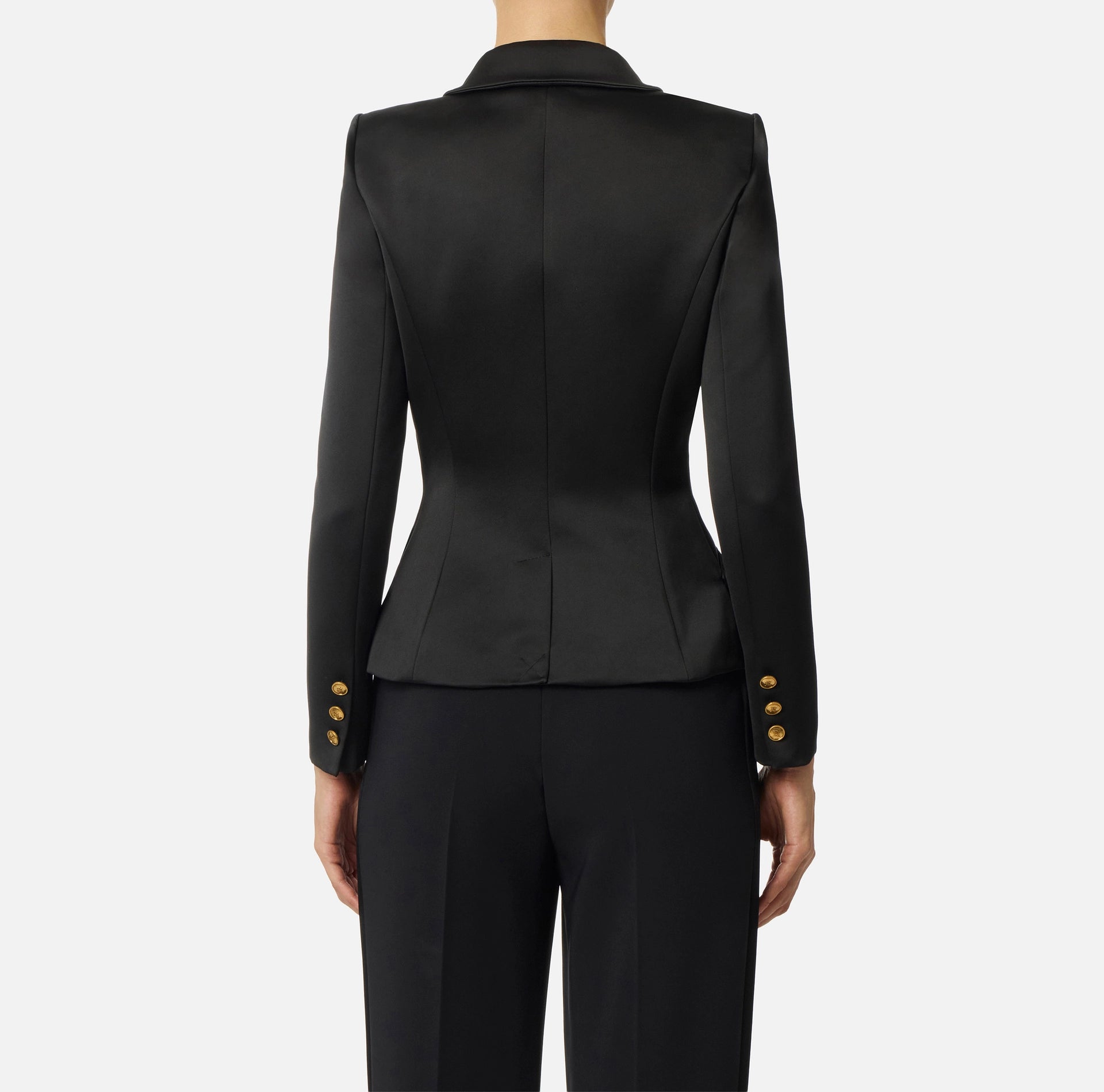 Black duchess satin structured jacket with gold buttons